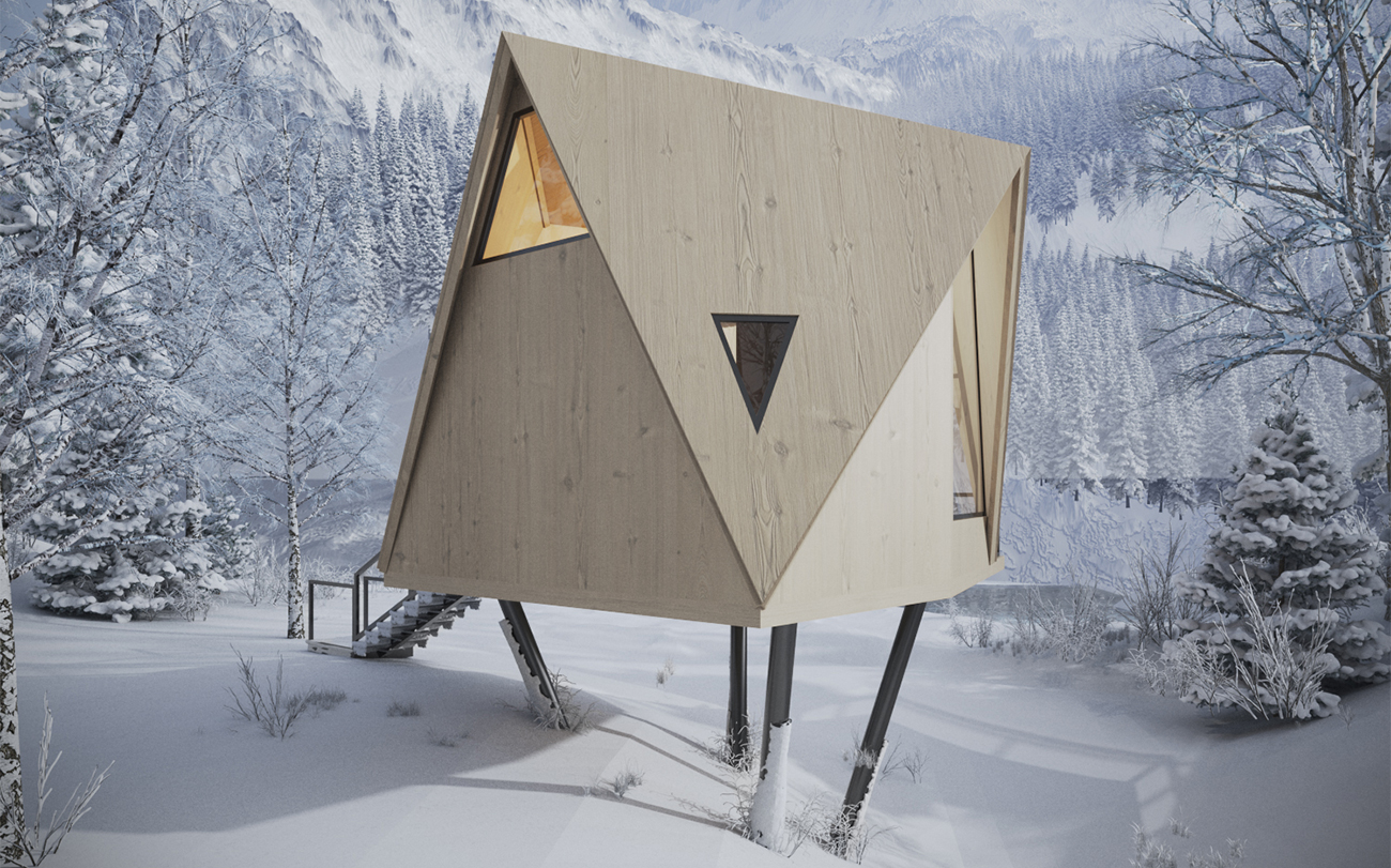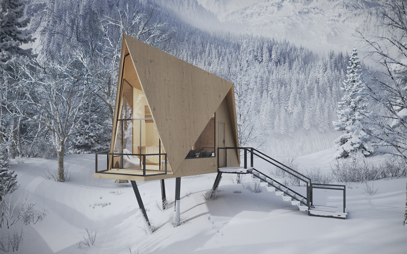 TRETOPPHYTTER Treetop Cabins: Envisioned for the adventurous tourist in Northern Norway, these architecturally stunning treetop cabins offer a perfect balance of shelter from harsh weather while still exposing guests to the extreme natural beauty of their surroundings. Designed for short-term stays, each compact cabin includes all essential amenities: a bed, kitchenette, bathroom, and lounge area. The architecture seamlessly integrates into the landscape, functioning both as a discreet retreat and a distinct sculpture that enhances the serene woodland setting.