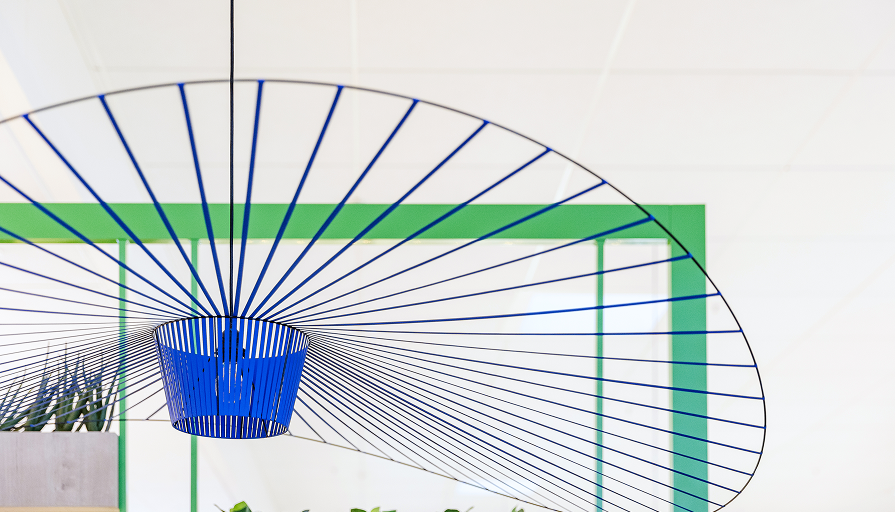 The design is driven by a bold material and color strategy drawn from the mall’s graphic palette. Primary colors — lime green, signal orange, and cobalt blue — are used architecturally to create a strong visual presence within a dense and active setting.