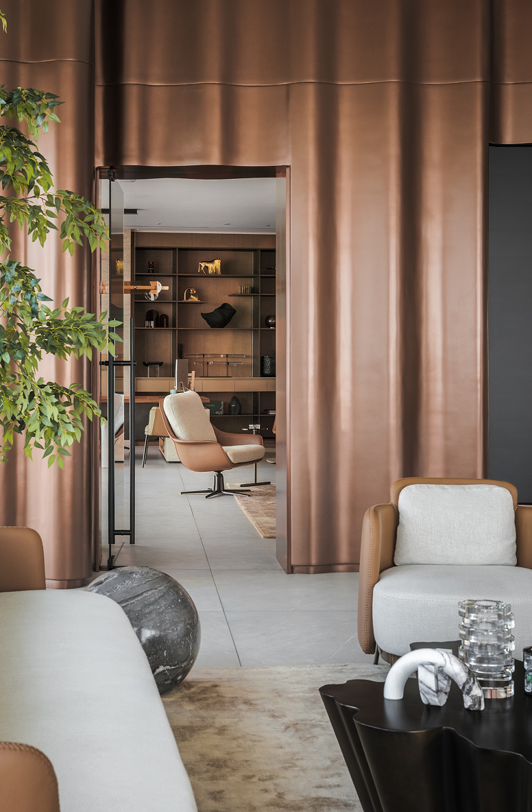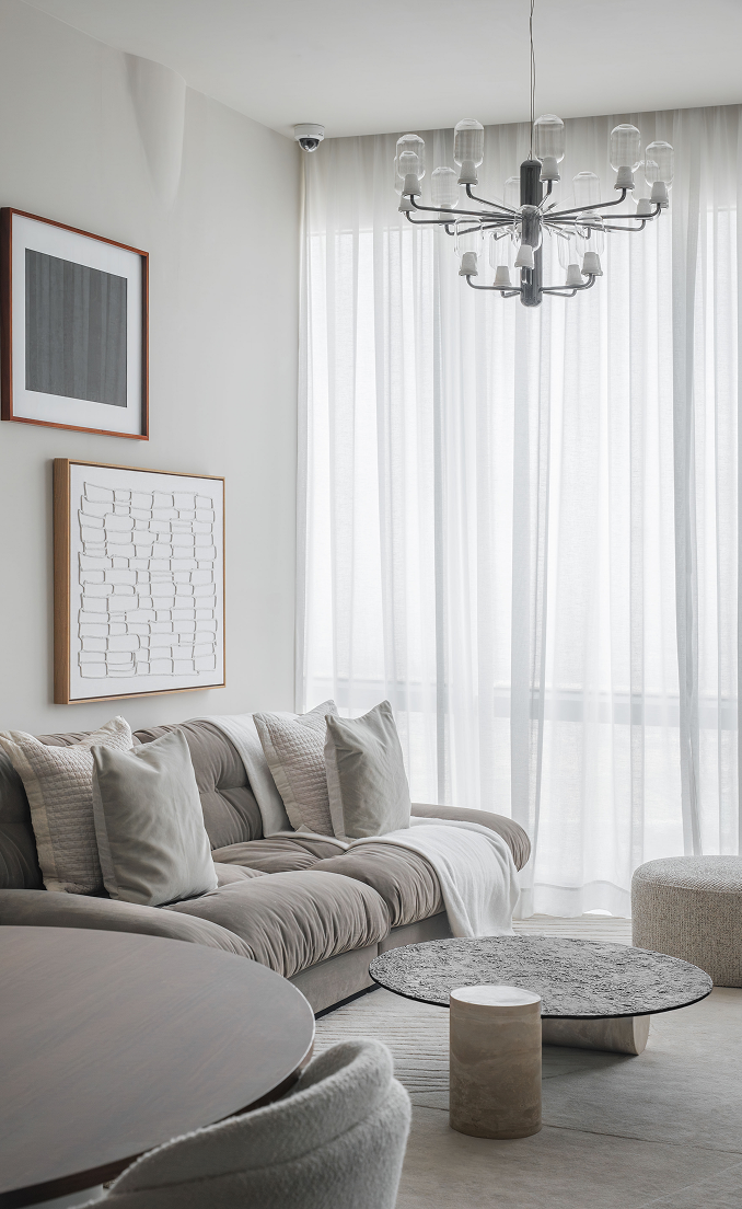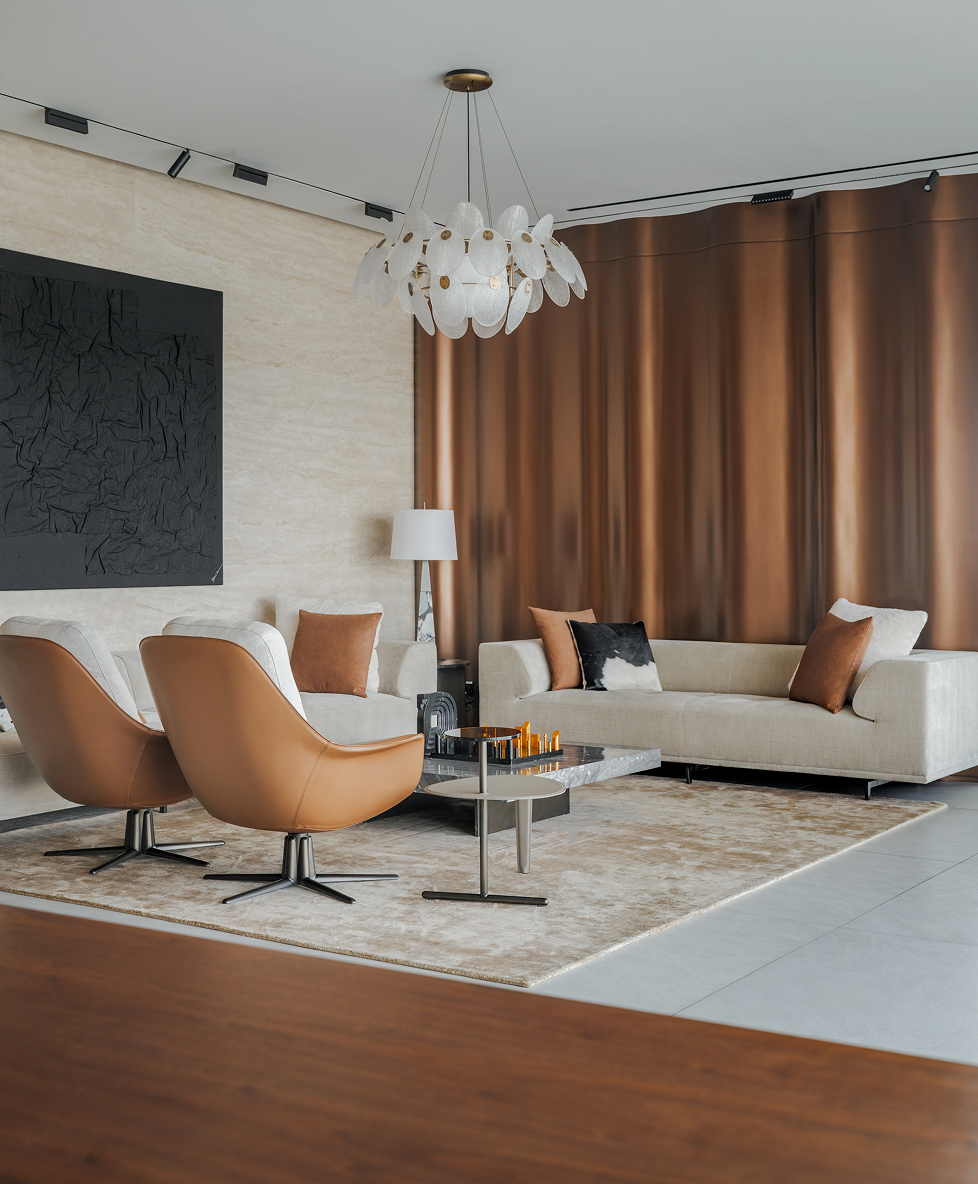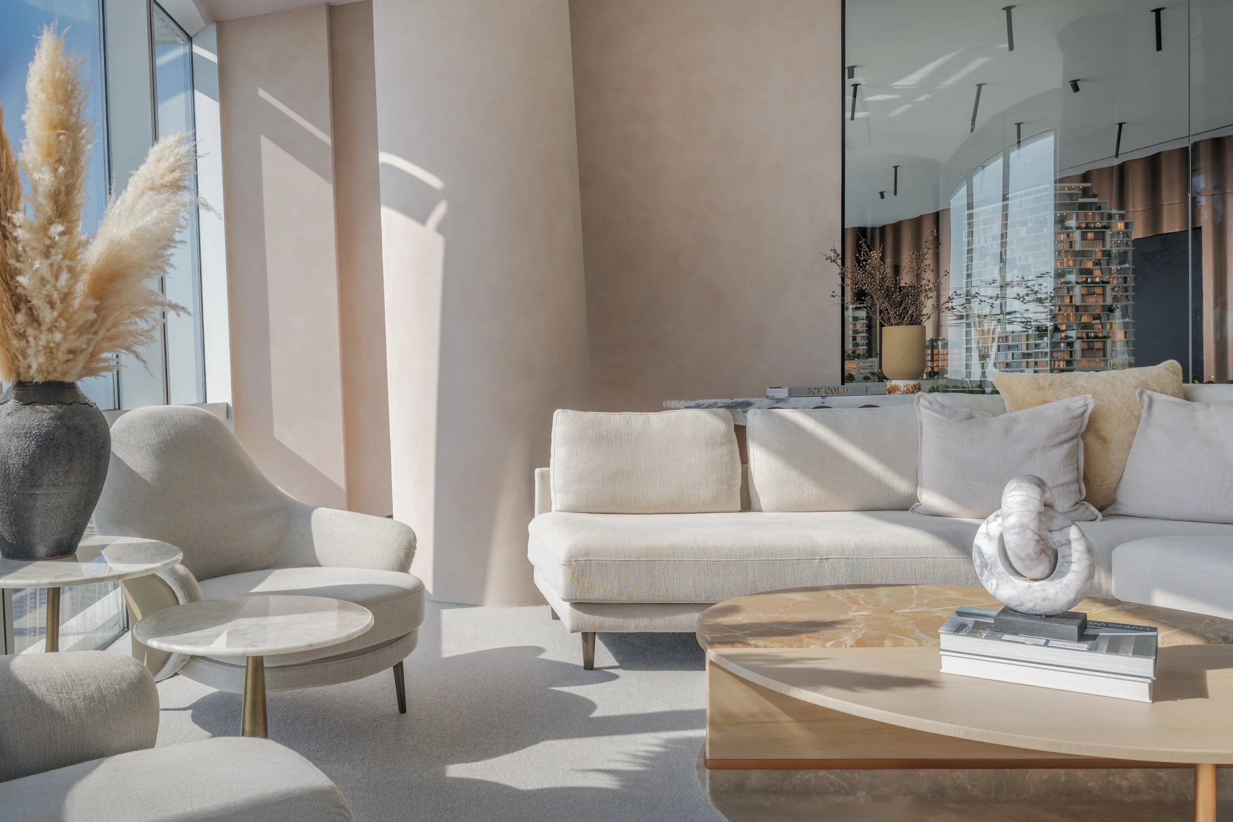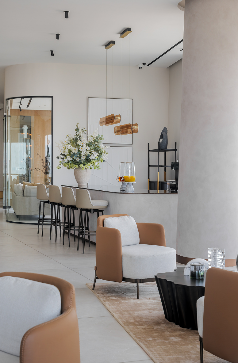 At its core, the interior features a dedicated zone showcasing a mock-up apartment, allowing visitors to experience the quality and atmosphere of Maaia’s residential developments first-hand. Meeting rooms are designed as relaxed, lounge-like settings rather than traditional conference spaces, encouraging open dialogue and a more personal approach to client meetings. The result is a contemporary sales environment defined by clarity, comfort, and a welcoming, residential feel.