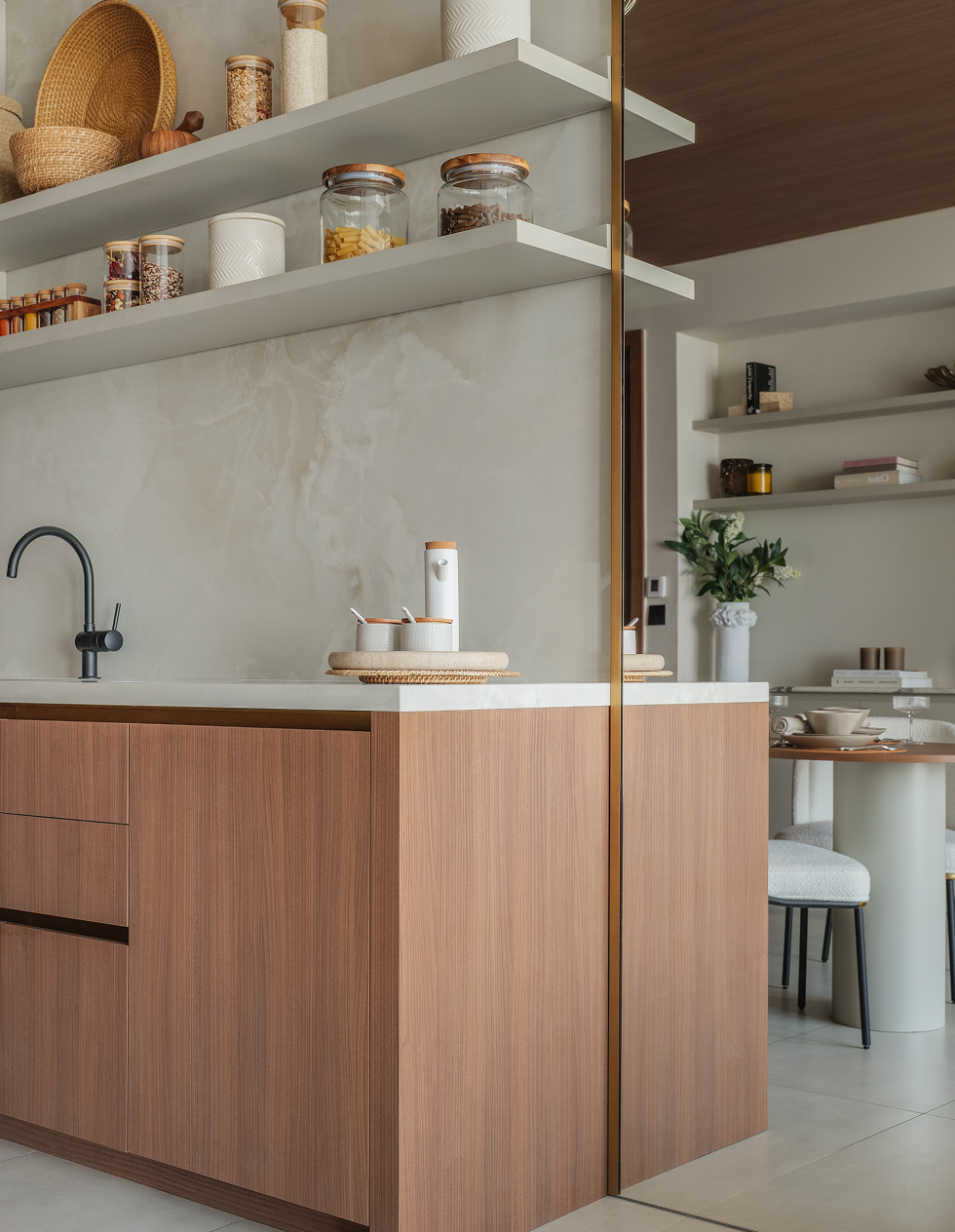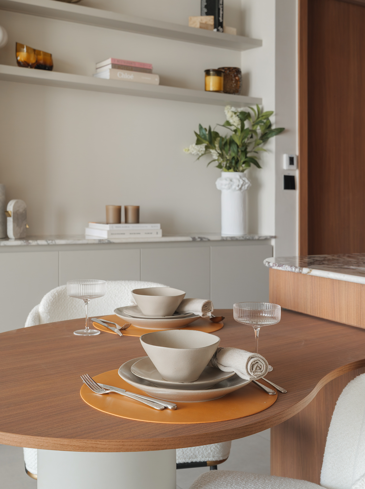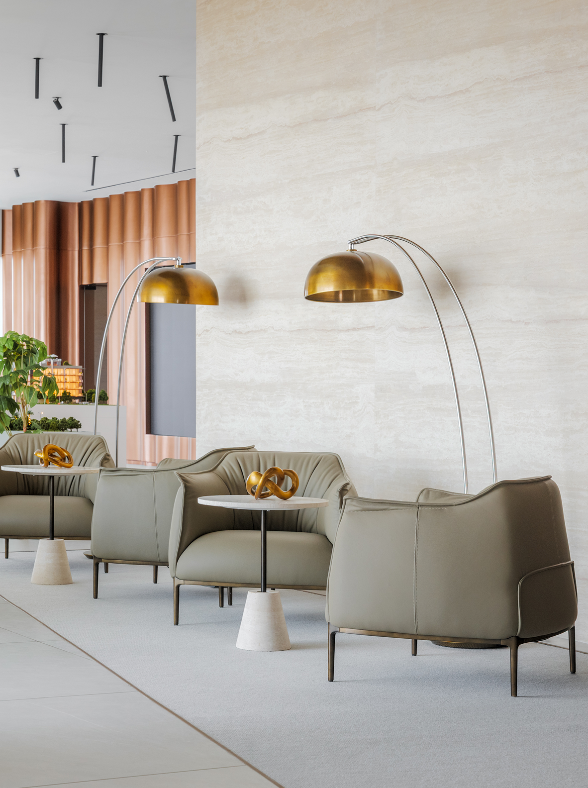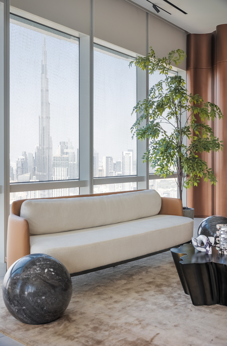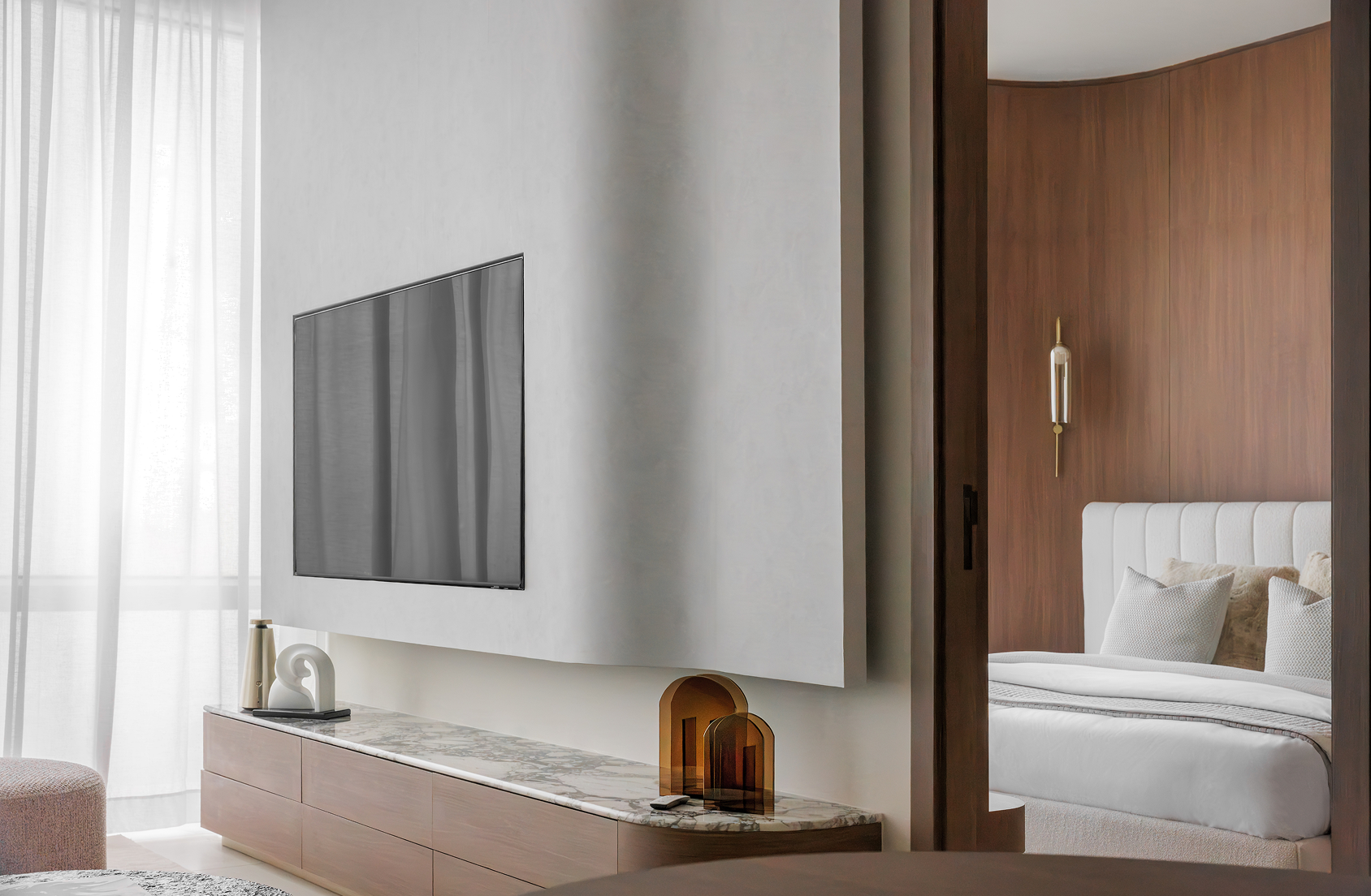 At its core, the interior features a dedicated zone showcasing a mock-up apartment, allowing visitors to experience the quality and atmosphere of Maaia’s residential developments first-hand. Meeting rooms are designed as relaxed, lounge-like settings rather than traditional conference spaces, encouraging open dialogue and a more personal approach to client meetings. The result is a contemporary sales environment defined by clarity, comfort, and a welcoming, residential feel.