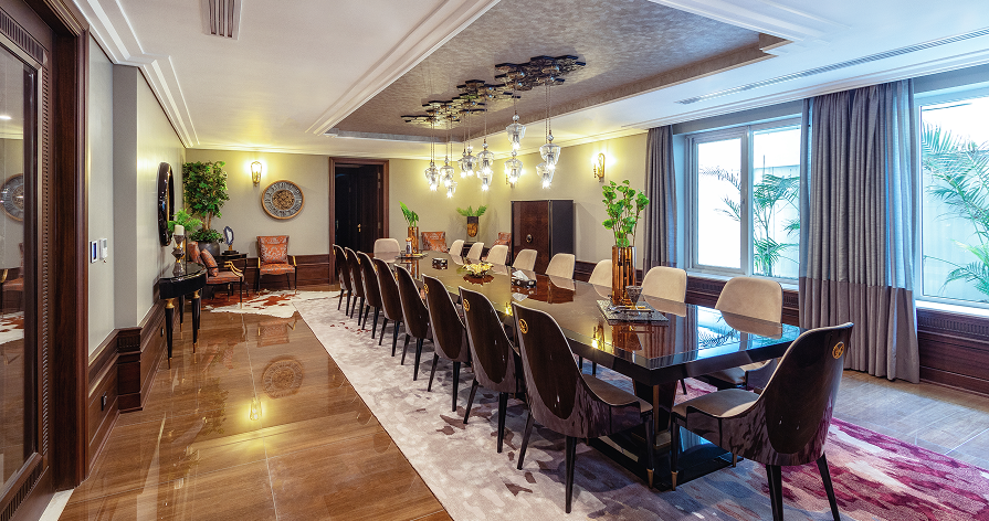 Private Neoclassical Villa in Lahore, Pakistan: This luxurious villa showcases a neoclassical interior that blends sophistication with functionality in Lahore’s serene locale. It features a private gym, cinema, and eight master bedrooms, each meticulously designed for comfort and style. The villa includes expansive social and private areas, ideal for hosting guests, alongside beautifully landscaped gardens and a serene indoor pool in the basement. High-quality materials and hand-picked furniture from around the world enrich every space. Detailed wall décor and plastered ceilings are custom-designed to complement the marble flooring, making every element of the villa an embodiment of exclusive craftsmanship.